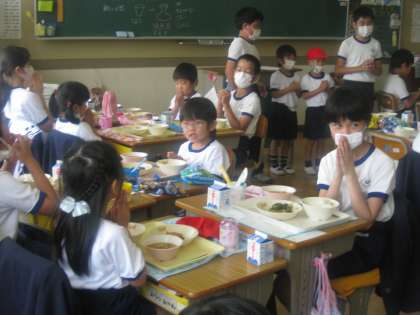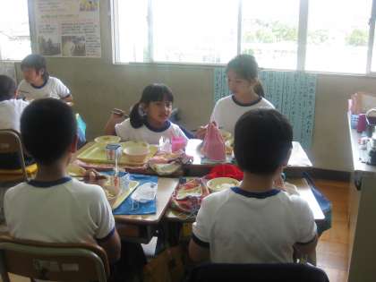 6年生と1年生がいっしょに給食を食べました。6年生は魚が苦手な1年生を応援したり、1年生に話かけたりして和やかに給食を食べていました。