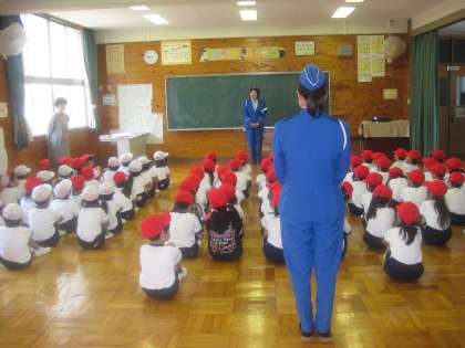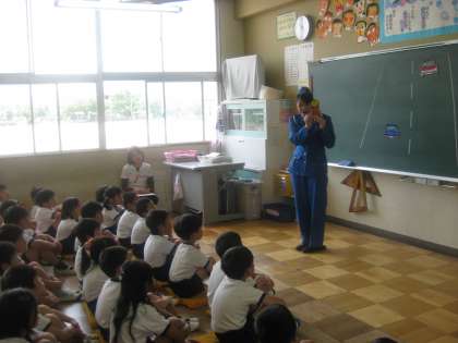 交通安全指導員による交通安全教室が1・2時間目1年生、3、4時間目2年生で開かれました。まず、指導員さんによる道路の歩き方や交差点の渡り方についてのお話を聞きました。