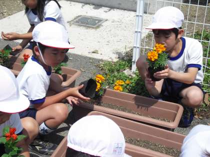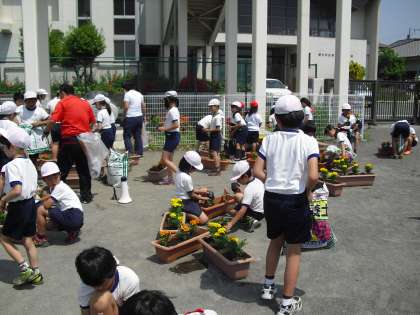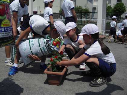 運動会で飾るサルビアの花のプランター作りを昼休みに園芸委員会の先生が放送で呼びかけたところ、多くの児童が集まってくれました。