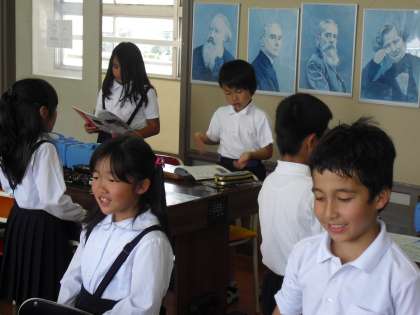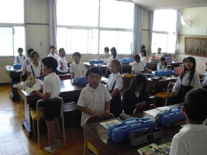 春の小川を歌っています。第2音楽室は教室よりも広いのでたくさん息を吸って遠くに声が届くようにしています。中には手でリズムをとっている子もいます。
