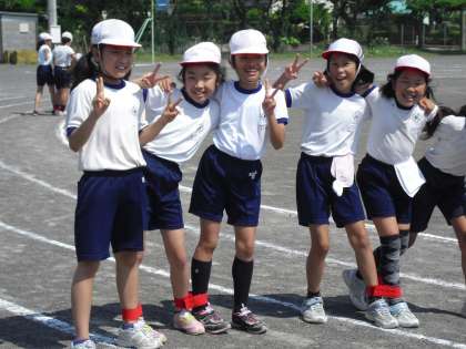 運動場では5年1組が団体競技の練習に励んでいました。二人三脚、三人四脚、ムカデと、どれもみんなの気持ちがそろわないとうまく進めません。どうしたらいいのと、さっそく集まって考え出す子どもたち。いい考えがいろいろ出ていました。