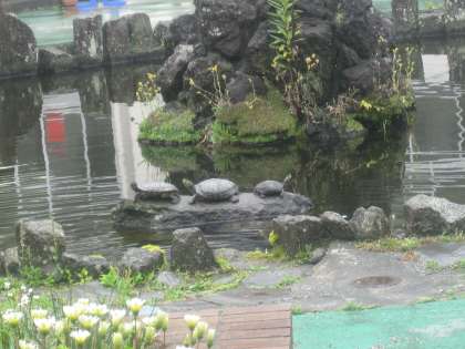 最近、水の中から石の上に姿を現している亀たち。今日は亀の親子?が石の上でひと休み。ほのぼのとした光景でした。