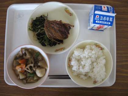 今日の献立は麦ご飯、牛乳、あじの干物の素揚げ、ほうれん草のピーナッツ和え、筑前煮です。あじの干物の素揚げはからっと揚げてあってとてもおいしいです。筑前煮などで野菜もたっぷりです。