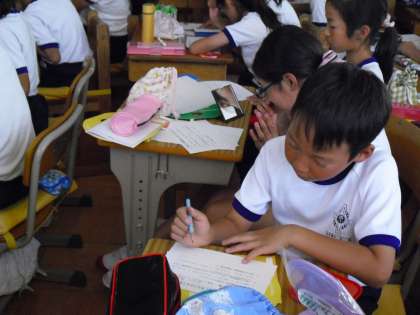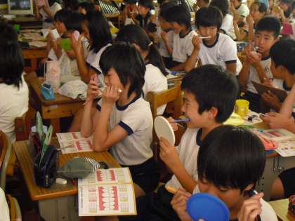 5年生は『歯と口の健康教室』を行いました。これはインターネット同時配信による全国規模の大会である「学童歯みがき大会」の中で行われているものです。オレンジルームのスクリーンに映し出される映像を見ながら、歯と歯ぐきの健康についてだけでなく,歯みがきの仕方についても学び、実際に練習を行いました。振り返りをするまであっという間でした。