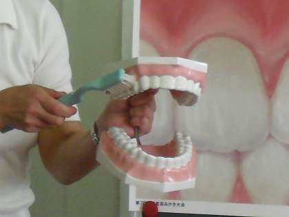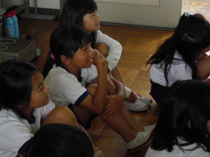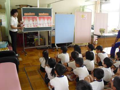 2年生の体重測定の様子です。どの学年でも、始めに養護教諭が保健指導を行ってから体重測定を行います。今回は「歯の磨き方」でした。「小刻みに歯ブラシを動かすんだよ。」の声に「こうかな?」と手を動かしている子も多かったです。