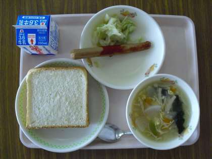 今日の献立はセルフホットドッグ、キャベツのソテー、卵のスープ、牛乳でした。せわりロールパンの予定でしたが、都合により角形食パンに変更となりました。少し食べにくくなったものの「おいしかったよ。」の声があちこちで聞えました。