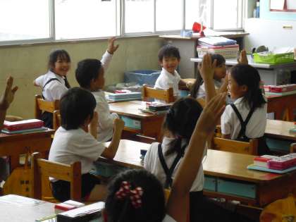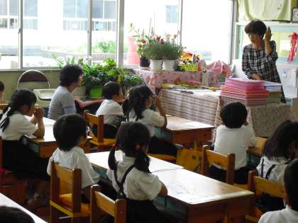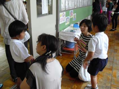 1年生は算数でした。1年生はお家の方が来てくださったことがうれしくてしょうがないようで、ついつい後ろ向きになってしまうこともありました。お母さんに問題を出してもらい、張り切って答えを言っていました。丸をもらって大満足です。