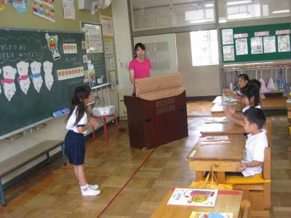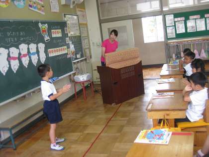 1年生のクラスでは、しろくまのジェンカにぴったりと合うリズムは何だろうという問いをもった子どもたちが、自分なりのリズムを考え発表しています。それを聞いた子どもたちは、そのリズムが自分や友達と同じであるとか違うとかつぶやきながら、とても興味を持って聞いていました。