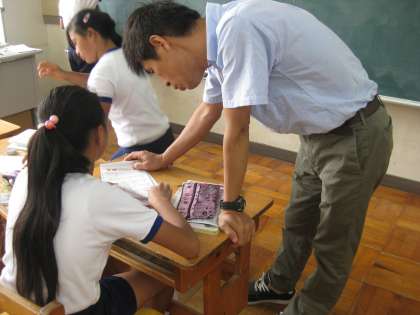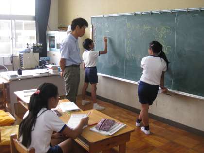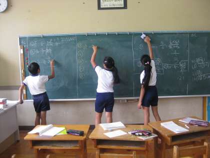 めぐみ学級では分数の割り算を、かけ算の式に変えて計算していました。難しいところは先生に聞いたり、お互いに相談しあったりして一生懸命勉強していました。