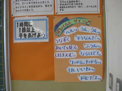 西小では、友達や先生の話をしっかりと聞く姿勢を大事にしています。聞くことは、他人の考えと比べて聞きながら、自分の考えを確認したり、深めたり、新たな考えに気がついたりするからです。また、しっかりと聞いているよというサインのために、反応も大事にしています。これは、2年生のクラスにあった掲示物です。聞くことは、相手を認め、信頼関係を深めることにもつながっていきます。