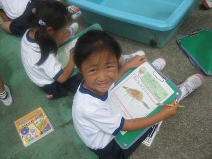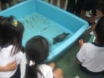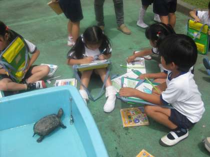 1年生の3クラスは中庭の水槽で飼っている亀の秘密について、スケッチをして調べていました。途中、亀が横になってしまうと、大丈夫かなとみんな心配していましたが、自分の力で元に戻ると拍手が起こりました。