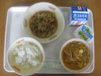 献立 ごはん ホイコーロー ピリからごまスープ あおうめゼリー 牛乳