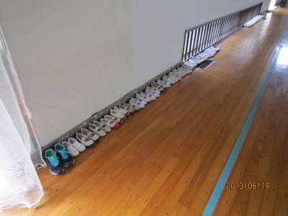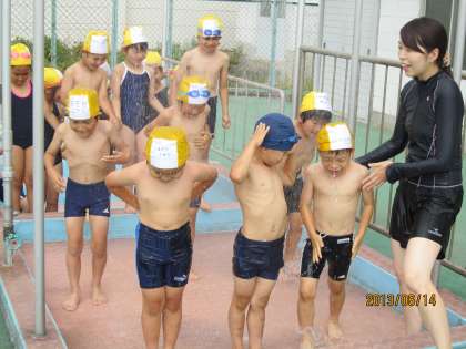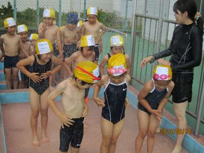 体育館に行くと上履きが学級ごときれいに並べてありました。今日は、1年生のプール開きです。プールに行くと大きな歓声が聞こえてきました。シャワーを浴びています。担任の先生と一緒に10数えるまで浴びます。
