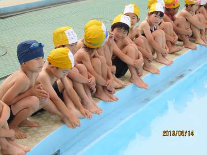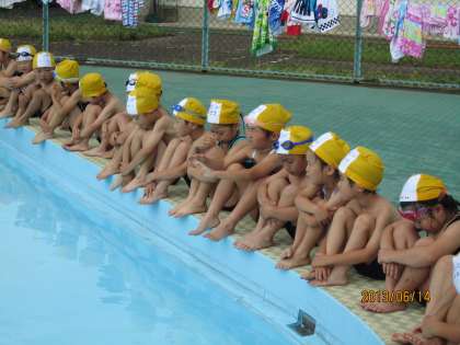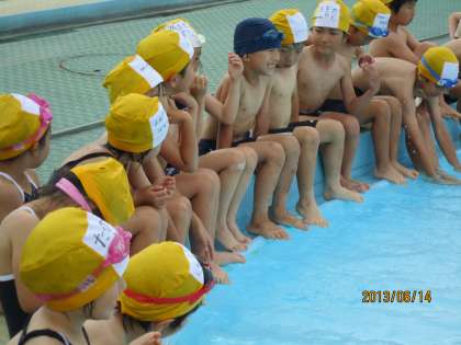 さあ、いよいよ水の中に入ります。でも、その前に、入るときの約束を確認します。きちんと並んで、しっかり聞いています。