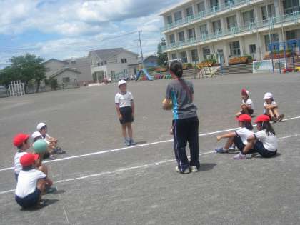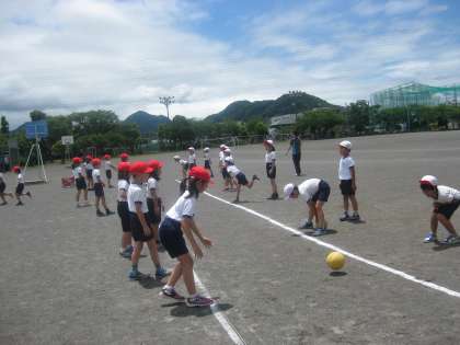 教育実習生の堀田先生が2年生のクラスで、体育の授業をしています。ボール投げで、ラリーを続けるためにはどうしたらよいかという学習問題を持った子どもたちは、投げてと取り手の両方から続ける工夫を考えています。相手がとりやすいやさしいボールを投げるや胸の前でしっかりとるなどの意見が出ていました。その後の練習ではとても上手になりました。
