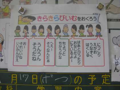 1年生の教室に貼ったあった掲示物です。友達の発表に対する反応をとても大事にしています。