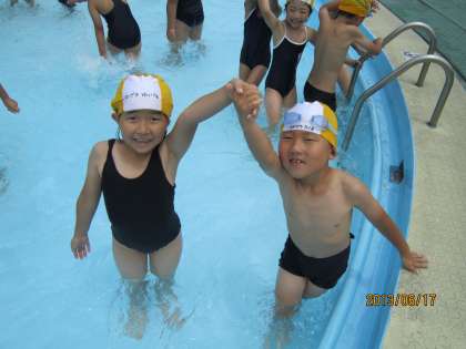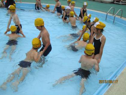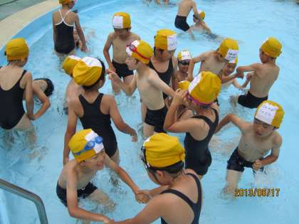 プール内では、安全のためにバディでの活動が多く、指導者が「バディ」と叫ぶと「おー」と言って手をつないで相手を確認していきます。水慣れもバディで行いました。