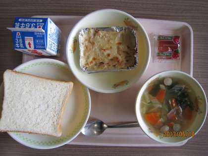 今日の献立は、マーガリン入り食パン、イチゴジャム、牛乳、米粉の山海ヘルシー豆乳グラタン、野菜のスープです。今日も、清水町産のジャガイモとタマネギが使われています。