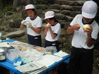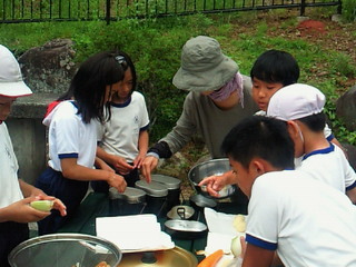 野菜を切ったり、火を起こしたりしています。保護者の方もお手伝いに来てくださっています。ありがとうございます。