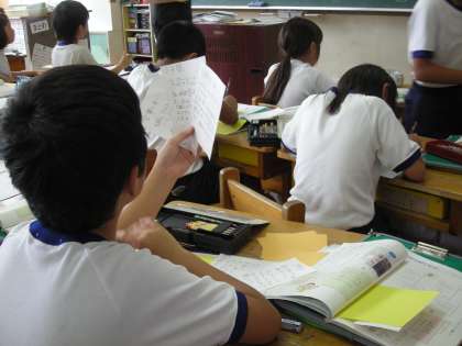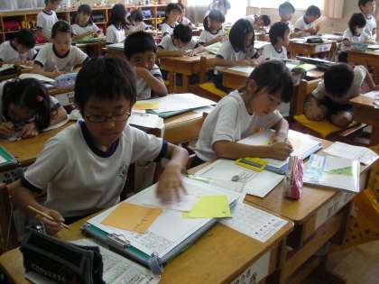 「見てきたことを新聞にまとめよう」の学習で、エスポットへ行って書いてきた割りつけカードをもとに新聞にまとめています。見つけたことがたくさんあるので、どれにしようか考えています。