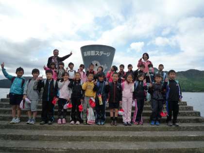 いろいろな魚を見たり、湖畔でおやつを食べたり、72人全員が元気いっぱいの笑顔でした。