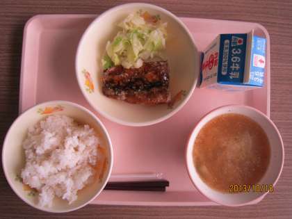 今日の献立は、麦ご飯、牛乳、さんまの蒲焼き、しおゆでキャベツ、根っこ野菜のごま味噌汁です。今日の味噌汁は、ごまの風味がほどよく、いつにも増して美味しかったです。