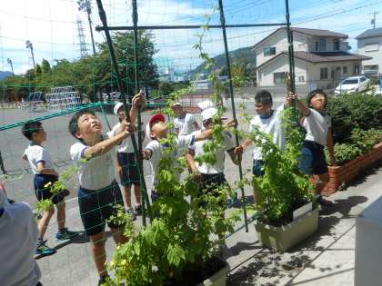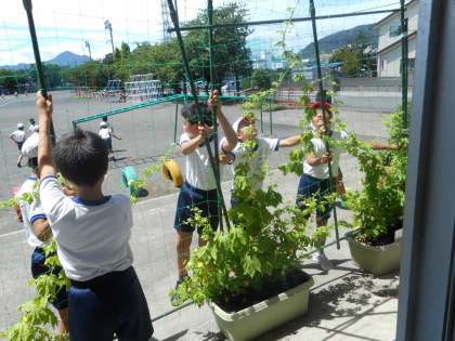 台風の被害を受けないようにゴーヤのカーテンの支柱をはずしてありましたが、中休みに6年生の男子児童がもとに戻してくれました。ありがとうございました。