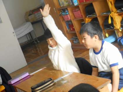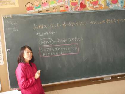 1年生のクラスでは、学校の草取りをいっしょに行ったシニアクラブの方々にお礼の手紙を書くために、どんな内容を書いたらよいかみんなで話合っていました。いっしょにできて楽しかったことや校庭がとてもきれいになったこと、おかげでその後も気持ちよく遊べることなど、多くのよい意見が出されました。