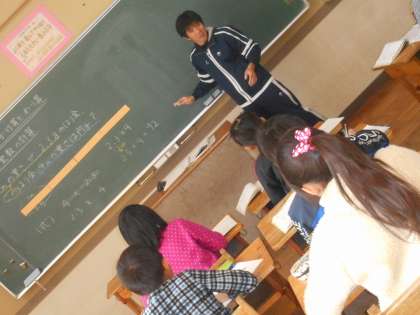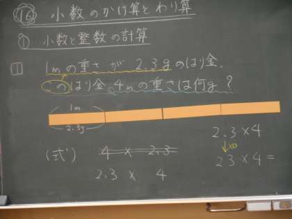 4年生の少人数の算数は、少数のかけ算とわり算の単元に入りました。1時間目の今日少数のかけ算を勉強していました。2.3×4の計算について、具体的な場面を下に意見を交換していました。