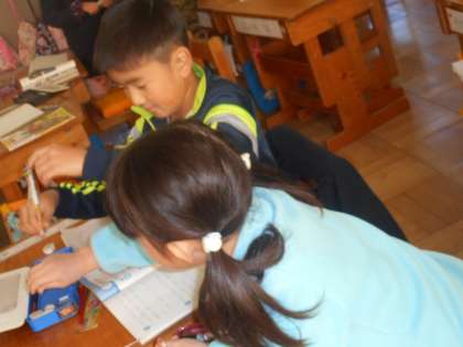 1年生は算数で、どうしたら長さを比べられるかなという問いを考えていきました。