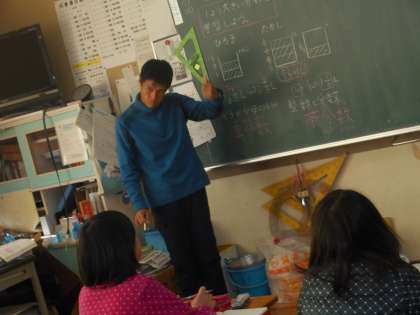 4年生のクラスでは、1より大きな数を分数であらわそうという学習問題に図を書き表しながら、問題を解いていきました。