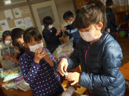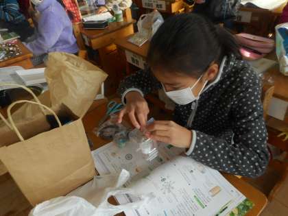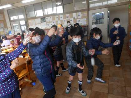 2年生の図工では動くおもちゃを作っていました。完成した児童はそれでうまく遊べるかを試していました。ピンポン球ペットボトルなど、楽しそうなおもちがたくさんできあがっていました。