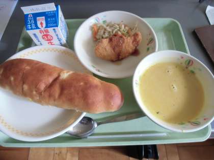 コーン入りロールパン、牛乳、ササミチーズフライ、味噌ドレッシングサラダ、かぼちゃのポタージュ
