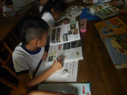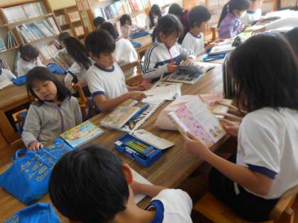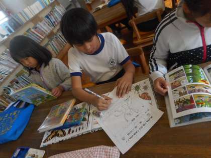 2年生の生活科の授業では、図書室で魚やかになど、自分の調べたいものを図鑑を調べながら、レポートをまとめていました。とても真剣にできていました。