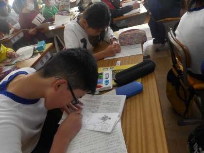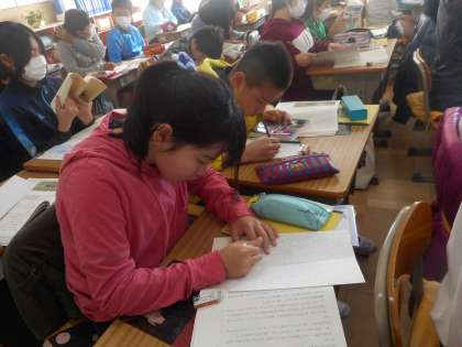 6年生は、国語の時間にきつねの窓を勉強し、あらすじなどをリーフレットにまとめていました。これまで勉強したことを自分のことばでまとめる学習になっていました。