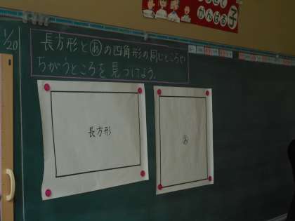 2年1組では、1人1研究授業のために、算数の授業公開を行いました。長方形の性質をもとに、正方形の性質を考えていく授業でした。長方形と正方形の同じところと違うところを角と辺という視点から考えていきました。子どもたちは、とても落ち着いており、一人一人よく考えて授業に臨んでいました。