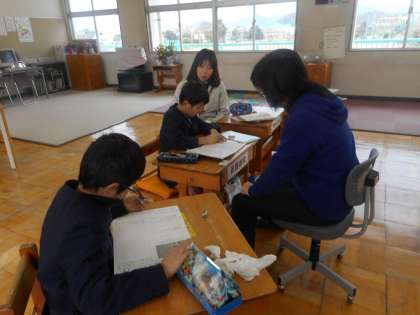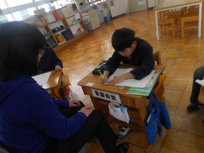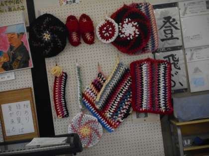 いずみ学級では、国語の漢字や算数のプリントなど自分の課題に沿って学習を進めていました。教室に後ろには、生活単元で行った、編み物のザブトンの作品が展示されていました。とても上手です。