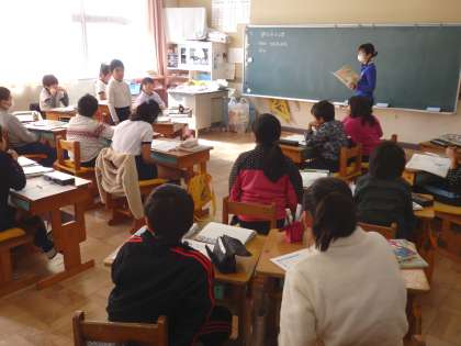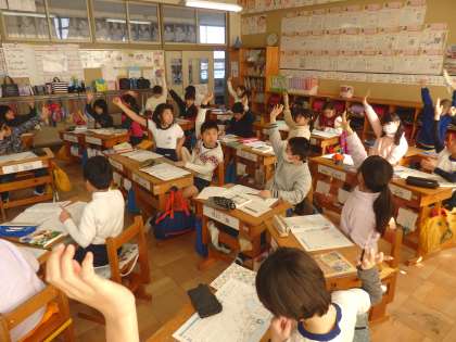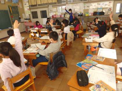 4年2組の社会科の授業の様子です。単元は「静岡県の工業」、清水町の位置を確認している場面です。