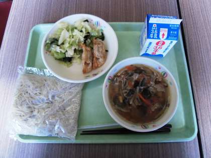中華麺、牛乳、あんかけ醤油ラーメン、揚げ餃子、野菜炒め