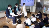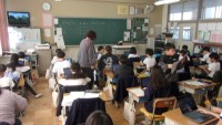 1年1組の国語の授業です。教材は「むかしばなしをよもう」です。低学年では、物語の世界に想像を広げ、楽しみながら読書しようとする態度を育てることを目標にしています。廊下には、並行して子供たちが「昔話に興味・関心をもつように」と、様々な昔話の絵本が陳列されていました。