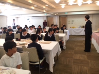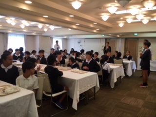 ホテルの方へ感謝の気持ちを込めて挨拶しました。また、今日の班活動の確認をしています。