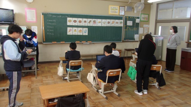 2校時にいずみ3で「外国語/外国語活動」の公開授業がありました。「What would you like?」(7時間扱い)の単元です。子どもたちは、黒板に提示された16種類の料理を4×4のBINGO...