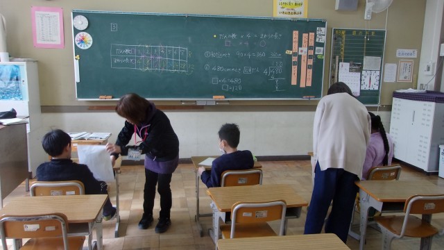 3校時の授業は算数です。4年算数の「ともなって変わる量」を学習しています。所属学級と同じように「正方形を階段状に積み上げていったとき、段の数が1増えると、周りの長さはどう変わるか?」という学習課題を...