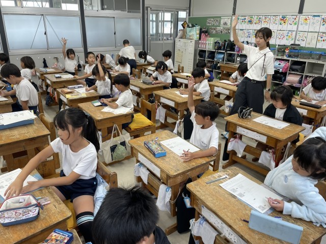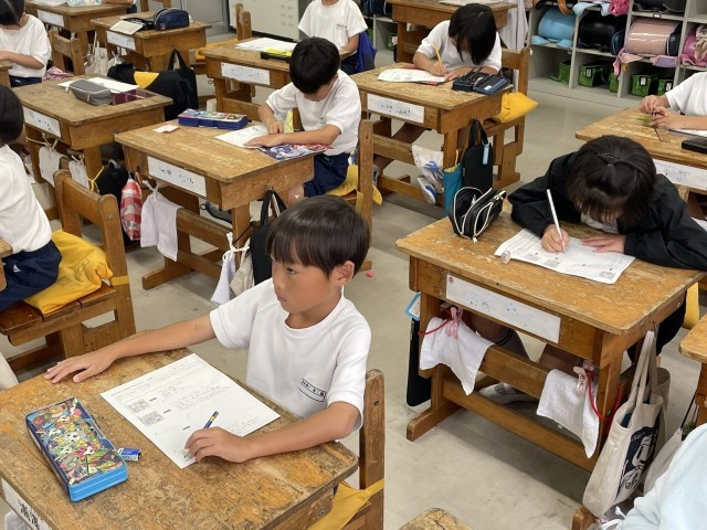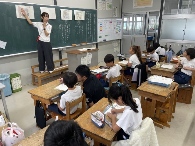 国語の授業です。先生が紙芝居の読み聞かせをしてくれますが、お話の途中が抜けてしまっています。前後の絵やお話から、登場人物の行動や気持ちを考えながら抜けてしまっている場面のお話を想像します。子供たちは、お話のつながりを考えながら、想像を広げて物語を書こうとしていました。