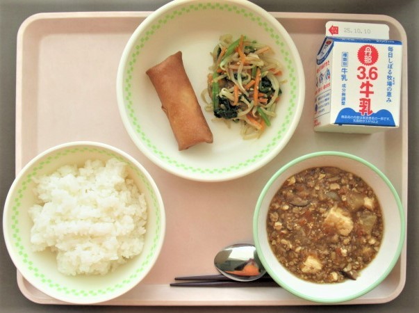 今日の給食は、「マーボー大根」が出ました。マーボー豆腐に大根が入っているイメージです。この中に入っているお豆腐にもしっかり火が入っているかを給食室では確認しているそうです。全体の温度も、もちろん測定しますが、豆腐のたんぱく質も中心部までしっかり火が入っているか確認することも大事なことなのだそうです。本当に細かいところまで注意を払って給食を作ってくれていることに感謝です。