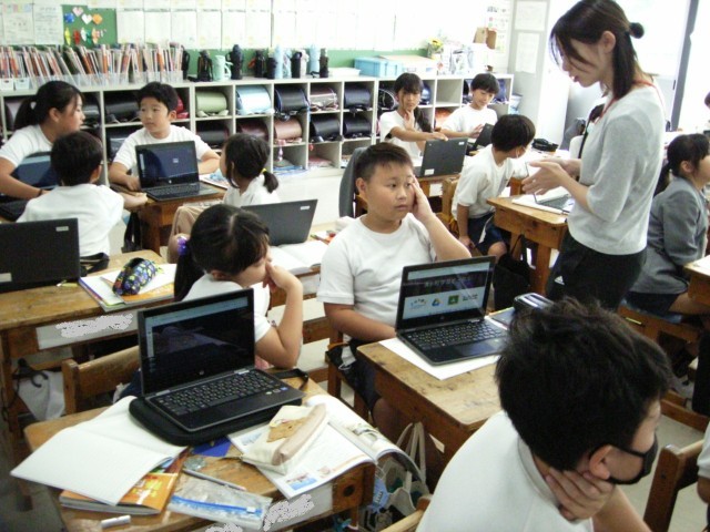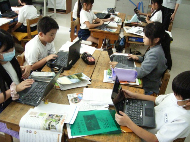 社会の授業です。風水害が起きた時、どのような立場の人がどのような対応をしているか、勉強をしています。先日の記事にあげたように、これまで、役場や消防など、社会の仕組みとして人々を支える立場の人の活動について調べましたが、今日は、自分自身にできることを考えます。普段、学校の避難訓練の際に意識している「おはしも」を学校外で災害にあった時にも意識することや、避難場所を確認することなど、自分自身や家族の安全を確保するためにできることやするべきことを調べまとめていました。