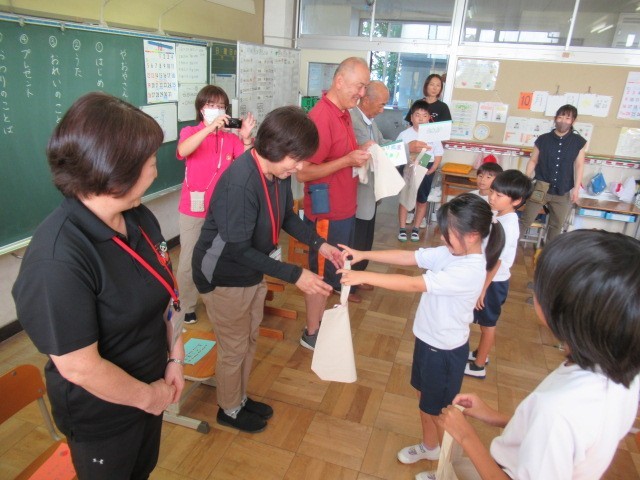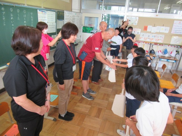 最後に、なかよし学級の子供たちが作った袋をプレゼントしました。デザインにオクラのスタンプを使っていました。とても上手にできていました。