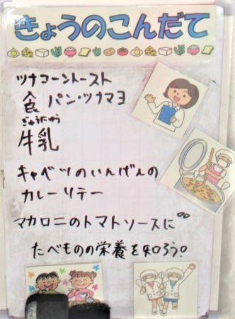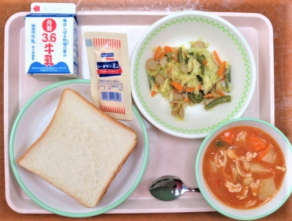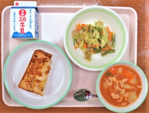 今日は、4~6年生が、食パンとツナマヨ、1~3年生となかよし学級が、ツナコーントーストでした。300枚以上のツナコーントーストを手作りで行ってくれる給食室のみなさんに感謝の気持ちをもって、たくさん食べてほしいと思います。