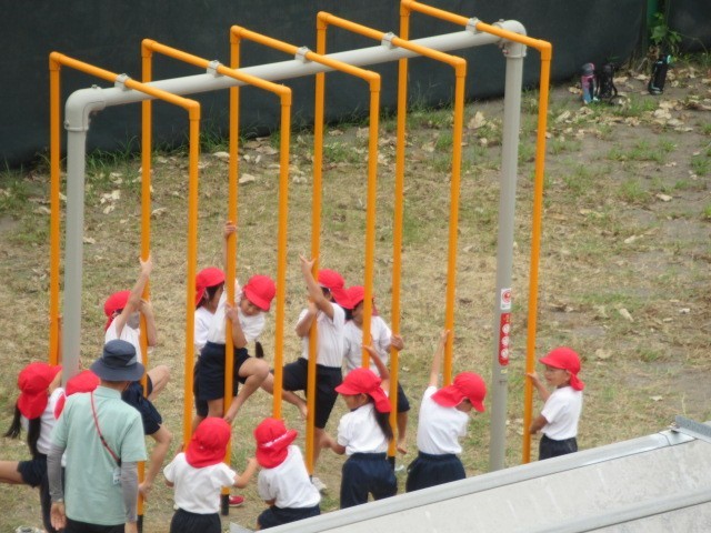 今日は、学年全体で運動場でいろいろな運動に取り組んでいました。鉄棒、上り棒、ボール投げ。体の使い方を学ぶことができますね。