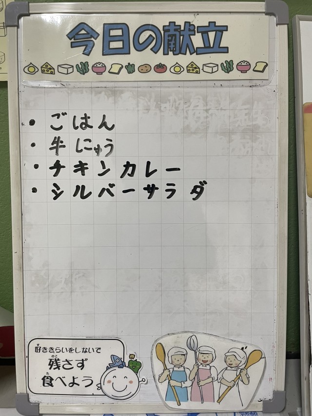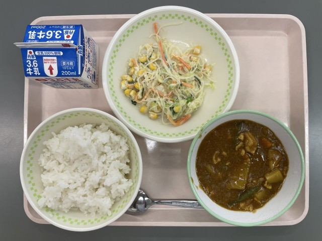 今日の給食は、チキンカレーでした。給食室で今日、カレー作るために使った玉ねぎの数は307個。30分かけてじっくりと炒めました。給食の人気メニューの一つです。季節の変わり目ですが、しっかりと食べて元気に過ごしていきたいですね。